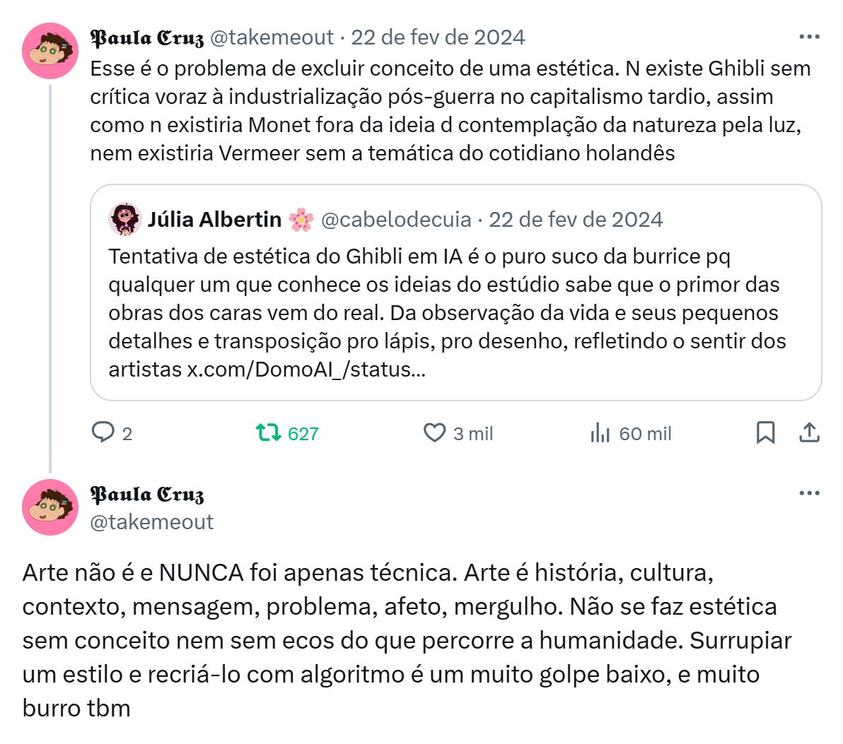 É preciso ser radical e não abaixar a cabeça. Não passar pano. IA é um tema tão espinhoso e cheio de lobby a ponto da própria esquerda relativizar algumas das questões que envolvem o assunto, como o uso de prompts para criar thumbnails de vídeos no Youtube (pelamordedeus, contratem um designer!) ou quando confunde-se o que é a patente de um monopólio com a proteção do direito moral e patrimonial de um autor. Não é sobre ego ou propriedade. É sobre direitos de trabalhadores e artistas frente uma das maiores ferramentas de precarização do trabalho dos últimos anos.