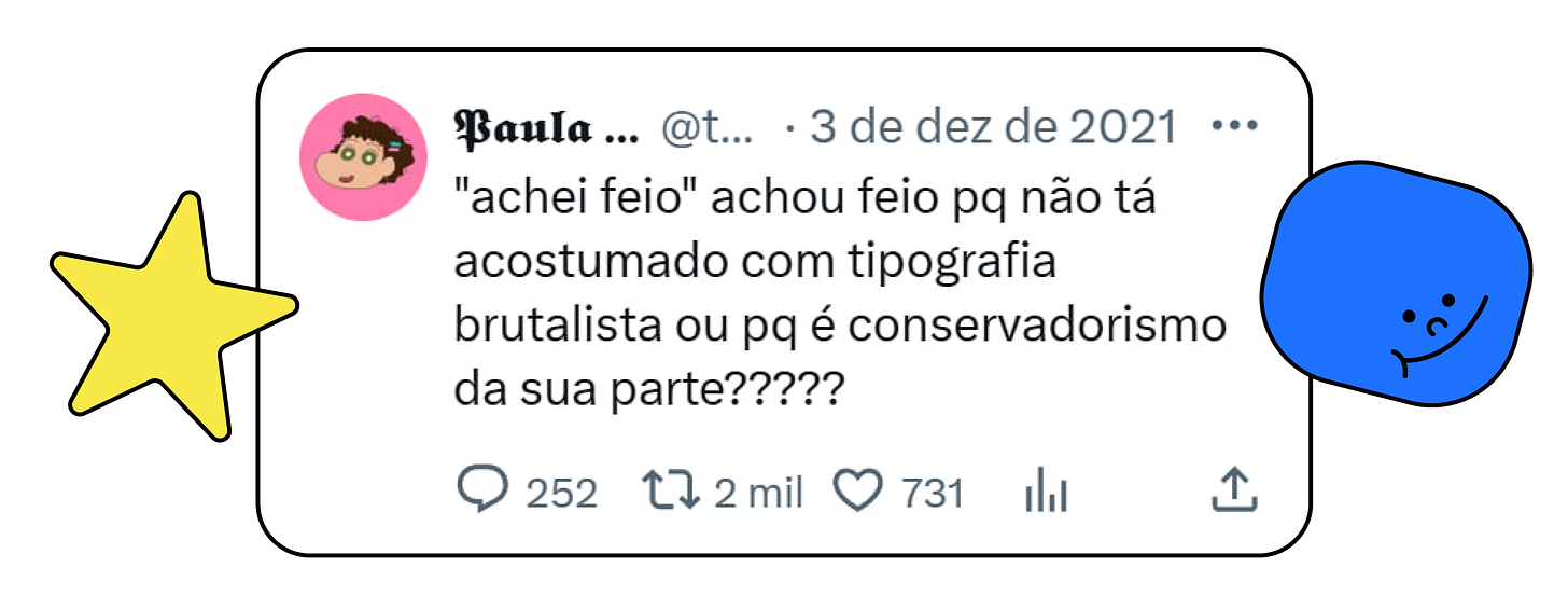 Foi lançando esse hot take (que na real eu nem acho tão hot assim) que eu sofri ataques em massa no famigerado Twitter durante a pandemia. Ao discordar do funcionalismo em tipografias, eu enfureci um monte de gente. Era uma galera me chamando de burra, vagabunda, etc. Nada de novo sob o sol. É normal ser atacada na internet por ser uma mulher online com opiniões. Eu já havia sido atacada em massa por reclamar do Pyong Lee no BBB, por falar que os filmes do Zack Snyder são ruins, mas dessa vez algo me chamou a atenção: muitas pessoas estavam irritadas comigo porque eu tive a pachorra de falar nem toda letra é para ler.