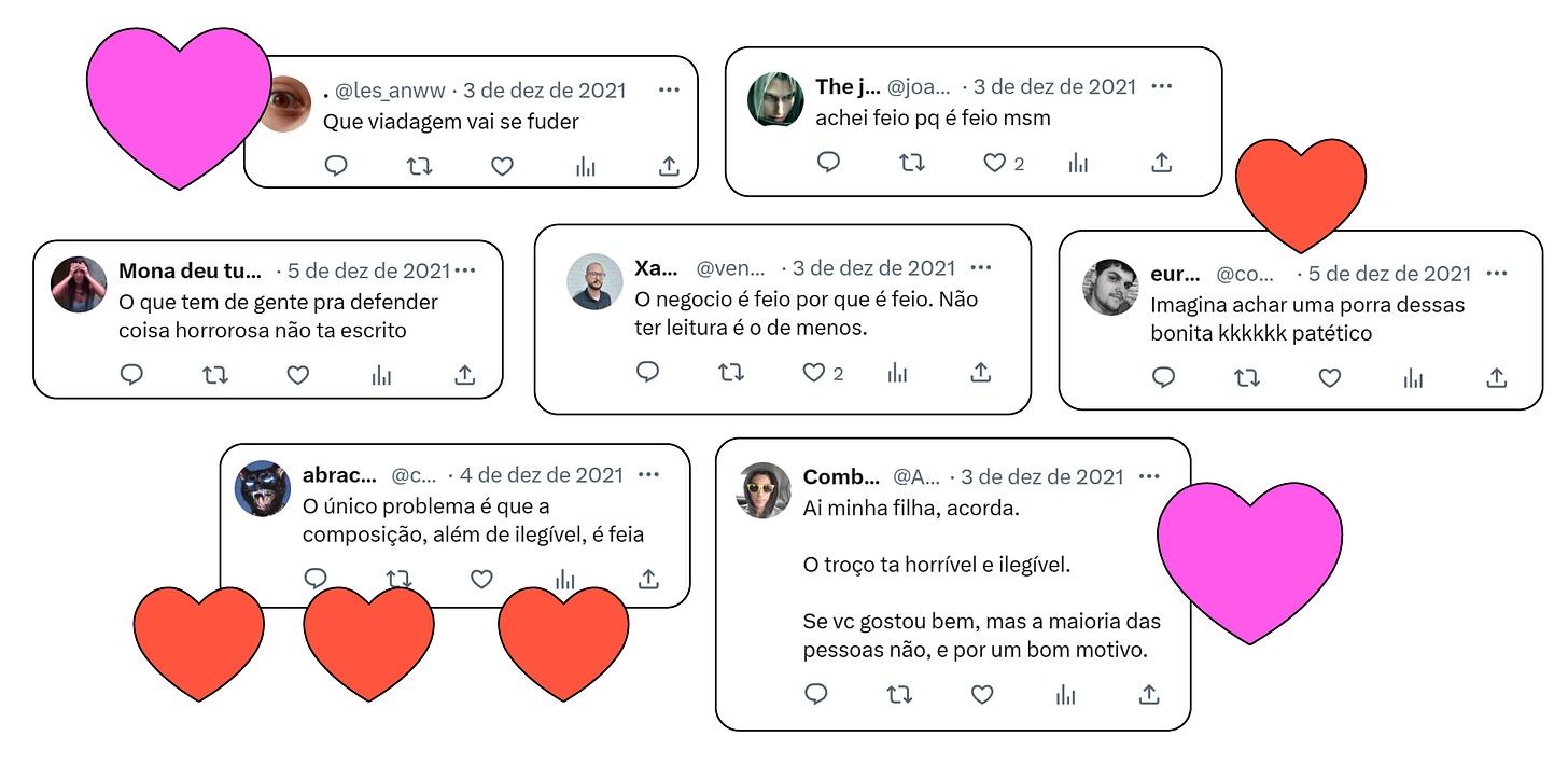 É também curioso como grande parte dos comentários neste caso do Wrapped resumiu o design da campanha a um ponto específico: “ficou feio”. Como se existisse algo objetivamente feio. Feio para quem? E feio por quê? No texto Gosto é que nem cu? abordei um pouco como beleza e feiura são construídas historicamente a partir de padrões, e como às vezes o esquisito e o inusitado são mais interessantes justamente porque trazem algo diferente à tona. Acredito ser o caso aqui também. Essas tipografias distorcidas causaram desconforto, estranheza, pois saem da expectativa. De certa forma, é uma discussão sobre padrão versus não-padrão. Se fosse uma Helvetica condensada mundana sem efeito, não existiria nenhum ai-mas-que-coisa-horrorosa-achei-feio-porque-é-feio.